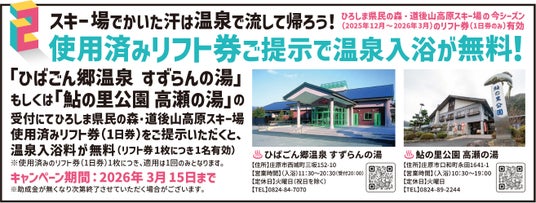 アフタースキーは温泉無料:使用済みリフト券(1日券)は、そのまま「ひばごん郷温泉 すずらんの湯」または「鮎の里公園 高瀬の湯」の入浴無料券となります。