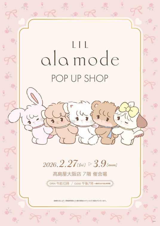 高島屋大阪店では、2月27日(金)~3月9日(月)の11日間に人気イラストレーター・mikko氏が描く、ガーリーで愛らしいキャラクターが魅力の「Lil ala mode(リルアラモード)」のポップアップショップを開催します。グッズの販売をはじめ、コンセプトである「小さくてチャーミングな仲間たちが集まり、『好き』や『夢』をぎゅっと詰め込んだ、とびきりかわいくておしゃれな世界。」の装飾や、原画作品の展示も行います。