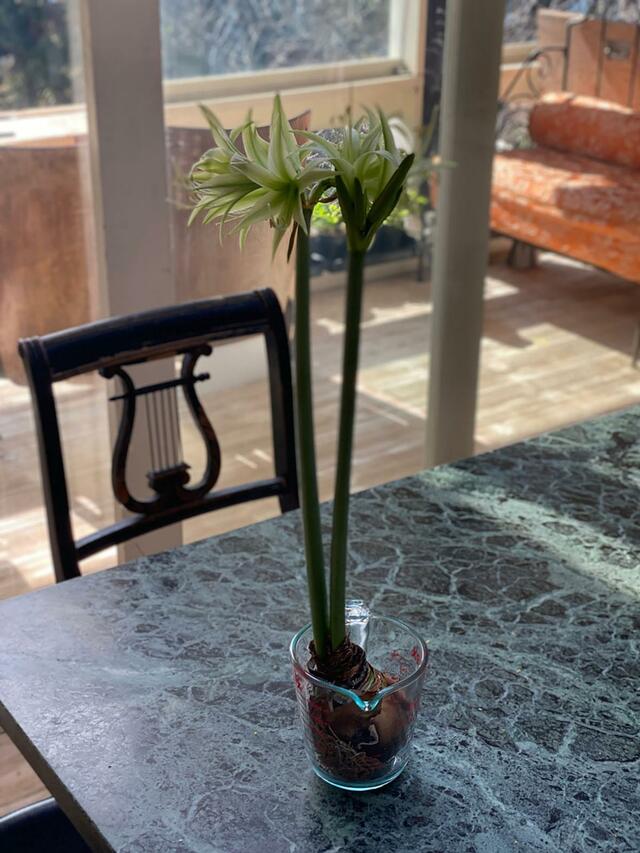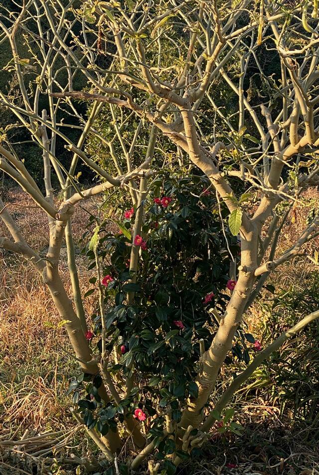 枯れ木になったトランペットフラワーの真ん中に椿の木が姿を表した。トランペットフラワーに守られて椿は育っていたのだね。綺麗な花を咲かせています。