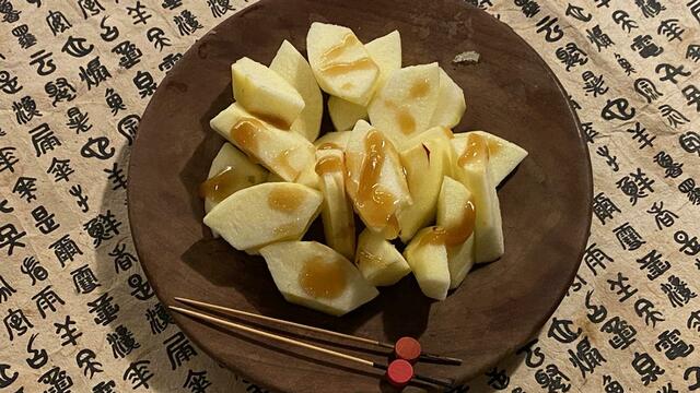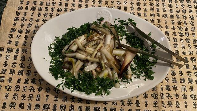 干した蕪の皮(ゴマだれ和え、菜の花載せ)、蕪の摺流し(きゅうり、わさび)、友さんのチャーシュー、