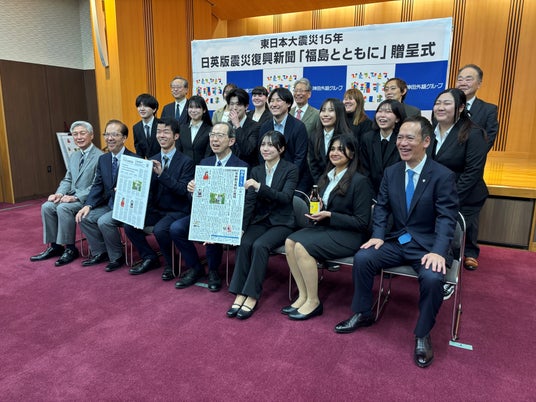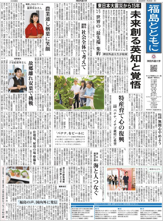 神田外語グループ(東京都千代田区/理事長:佐野元泰)は、東日本大震災・原子力災害から15年の節目にあたり、福島の復興と学生の学びを世界に発信する「震災復興発信プロジェクト」を展開しています。本プロジェクトの一環として、2026年2月17日(火)、グローバル人材の育成を目指す神田外語大学・柴田真一ゼミの学生代表4名が、海外大学の学生に向けて英語による発信を行います。学生たちは、福島県浜通り地域でのフィールドワークや取材活動を通じて復興の歩みや地域の現状について学び、その成果として日英版震災復興新聞『福島とともに(英題:”Together with Fukushima”)』を制作しました。また、本プロジェクトの節目として、2026年1月26日(月)に福島県知事・内堀雅雄氏へ新聞を贈呈しました。今回の海外発信では、本紙をもとに福島の現状や取り組み、人々の思いや挑戦を、学生の言葉で世界に伝えていくことを目指します。