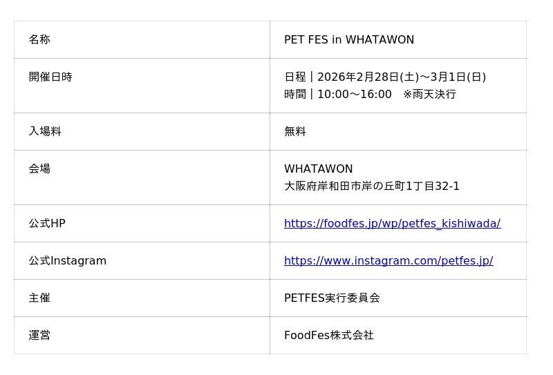 FoodFes株式会社(代表取締役:稲垣一馬)は、2026年2月28日(土)~3月1日(日)の2日間、WHATAWON(大阪府岸和田市)にて、「PET FES in WHATAWON」を開催いたします。