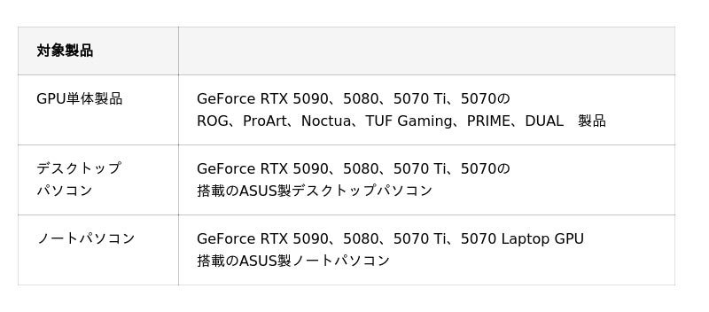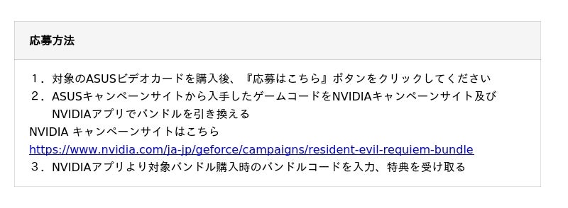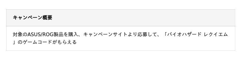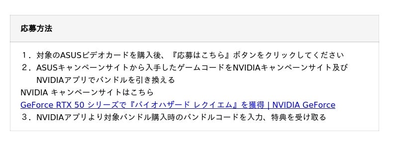 ASUS JAPAN株式会社は、ASUS/ROG製GeForce RTX 5070以上のビデオカード単品および、GeForce RTX 5070以上搭載のデスクトップ、またはGeForce RTX 5070 Laptop以上搭載のノートパソコンを購入で「バイオハザード レクイエム」のゲームコードがもらえるキャンペーンを発表しました。