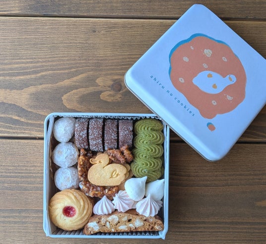 缶を開けると、真ん中にはお店を代表する「あひるサブレ」が。その周りを囲むように、さくっほろっとしたくちどけの良い”ブールドネージュ”や、自家製のジャムを絞ったクッキーなど、厳選したフランス産小麦と北海道産四つ葉バターを使用したクッキーが9種類入ったクッキー缶です。