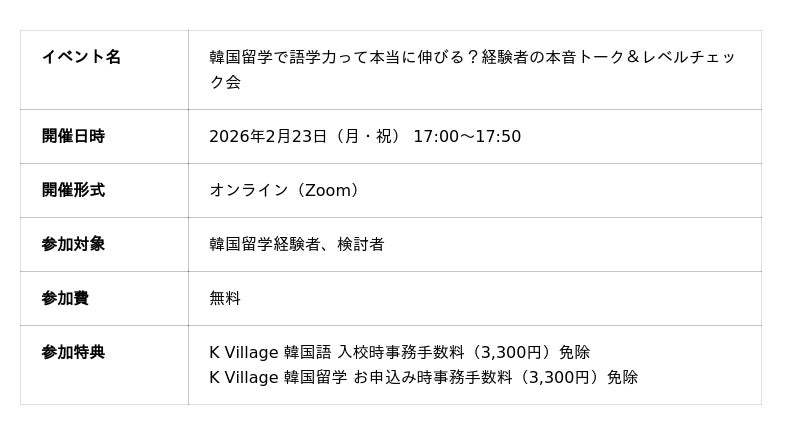 日本最大級の韓国語教室「K Village 韓国語」を運営する株式会社K Village(本社:東京都新宿区、代表取締役社長:桑原 元就)は、韓国留学経験者および検討者を対象としたイベント「韓国留学で語学力って本当に伸びる?経験者の本音トーク&レベルチェック会」を開催します。
