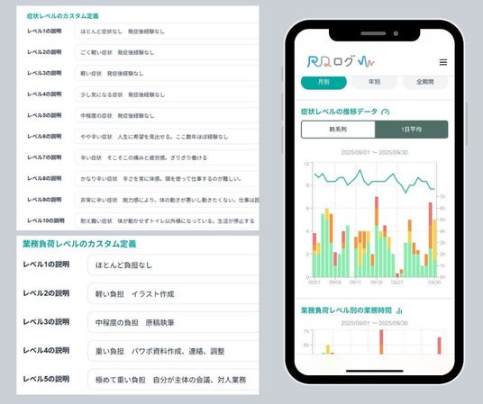 RDログとは、働く難病者の日々の体調や業務負荷、生活上の負荷を記録・可視化するアプリです。仕事や生活上の負荷および症状を当事者が記録し、可視化することによって、自⼰理解を深めることを目的としています。
