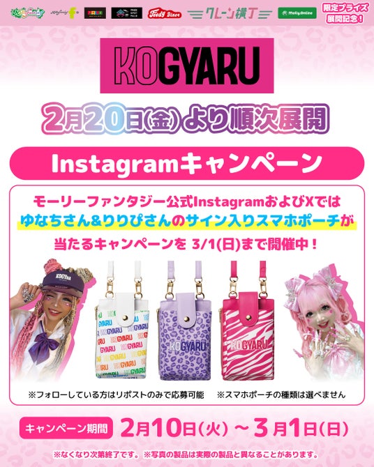 限定プライズの展開を記念し、モーリーファンタジー公式X・Instagramでは、『KOGYARU』モデルの「ゆなち」「りりぴ」の「直筆サイン入りKOGYARU スマホポーチ」が抽選で各3名さま、計6名さまに当たるSNSキャンペーンを開催いたします。詳細は公式アカウントをご確認ください。