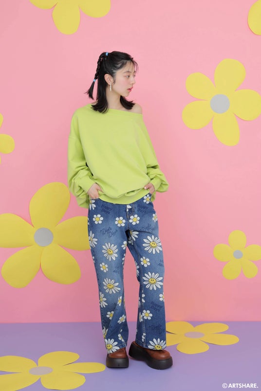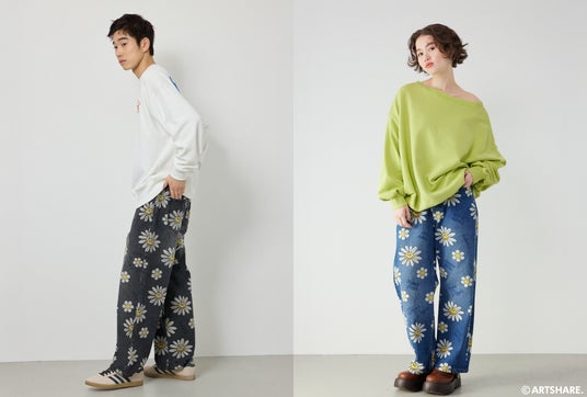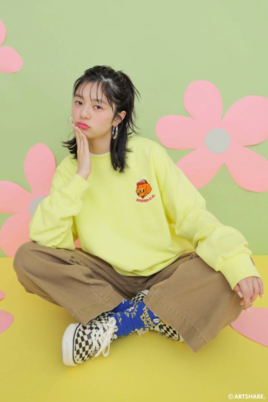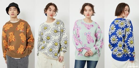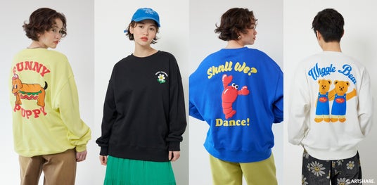 "Maximal HAPPINESS"をテーマに、カラフルで遊び心のあるデザインが特徴のwiggle wiggleオリジナルキャラクター「Smile We Love」「Wiggle Bear」「Little Play Bunny」のアートを、RODEO CROWNS WIDE BOWLの定番アイテムでもあるスウェットトップスやパーカー、デニムパンツに落とし込み展開。ジャガードや発泡プリント、刺繍などで施したスペシャルなデザインのアパレルアイテムは、すべてユニセックスで着用できるサイズ展開です。