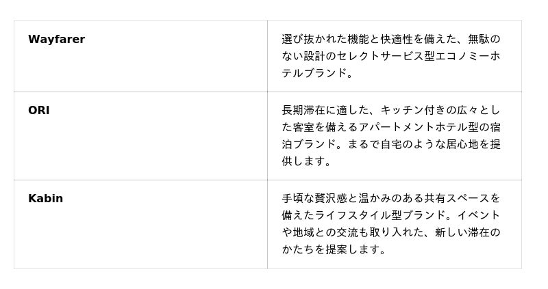現在、Wayfarerは以下3つの宿泊ブランドを展開し、多様な旅行者のニーズに応えています:
