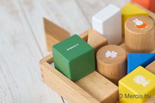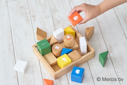 ディック・ブルーナが描く絵本で使われている鮮やかな「ブルーナカラー」を取り入れている点が特徴で、色を認識し始めるお子さまにとって、色彩感覚を育むのにぴったりです。イラストが描かれた6つのつみきは、振ると「カラカラ」と優しい音が響き、お子さまの好奇心を刺激します。