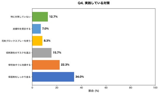 設問:花粉シーズンの肌荒れ対策として実践していることは何ですか?(複数回答可、最も重視しているものを1つ選択)