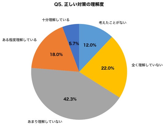「十分理解している」「ある程度理解している」を合わせても23.7%にとどまり、4人に3人以上が正しい対策方法を把握できていません。「考えたことがない」も12.0%存在し、問題意識自体が低い層も一定数いることがわかりました。