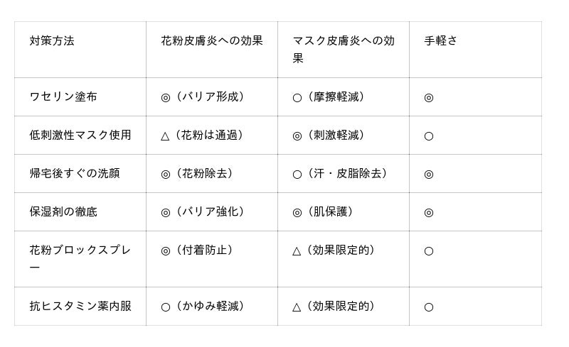 マスク皮膚炎との複合においては、マスク内部の高温多湿環境で肌バリア機能が低下し、そこに花粉が付着することで症状が悪化するという悪循環が生じます。また、マスクの着脱時に花粉が顔に付着しやすくなる点も見落とされがちです。