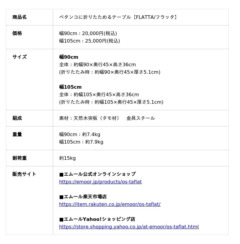 「寝る、座る、たたむ」に専門性を持った健康家具ブランドEMOORを展開する株式会社エムール(東京都立川市:代表取締役 高橋 幸司(以下、エムール))は、2026年2月10日よりペタンコに折りたためるテーブル『FLATTA(フラッタ)』の先行予約販売(2026年2月中旬入荷予定)を開始しました。テーブル幅90cmと105cmの2サイズ展開です。