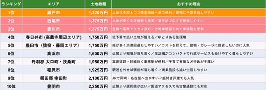 住まいの相談窓口「くふうイエタテカウンター」、家づくりやリフォームを考えている方向けの住宅イベント「くふうイエタテフェア」を運営する株式会社くふう住まい(本社:東京都港区、代表取締役社長:長井 健尚)は、愛知県内「くふうイエタテカウンター」9店舗のアドバイザーによるアンケート調査をもとに、同県内の「想定土地総額」をもとにした“穴場エリア”を調査しました。土地総額を基準に割安なエリアを算出した結果、瀬戸市が1位となり、続いて豊川市、高浜市が上位に入りました。
