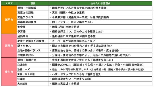 ・加えて、ハザード回避や地震への強さなどの安全面、山側を避けたい、暗い道は避けたい、住宅密集より適度な距離感を保ちたいといった住環境の好みによる絞り込みも確認されました。なお、同一市内でも町名レベルで希望を指定するケースや、逆に特定エリアを除外する条件が挙がるなど、エリア選びがより“具体化”している点も特徴です。