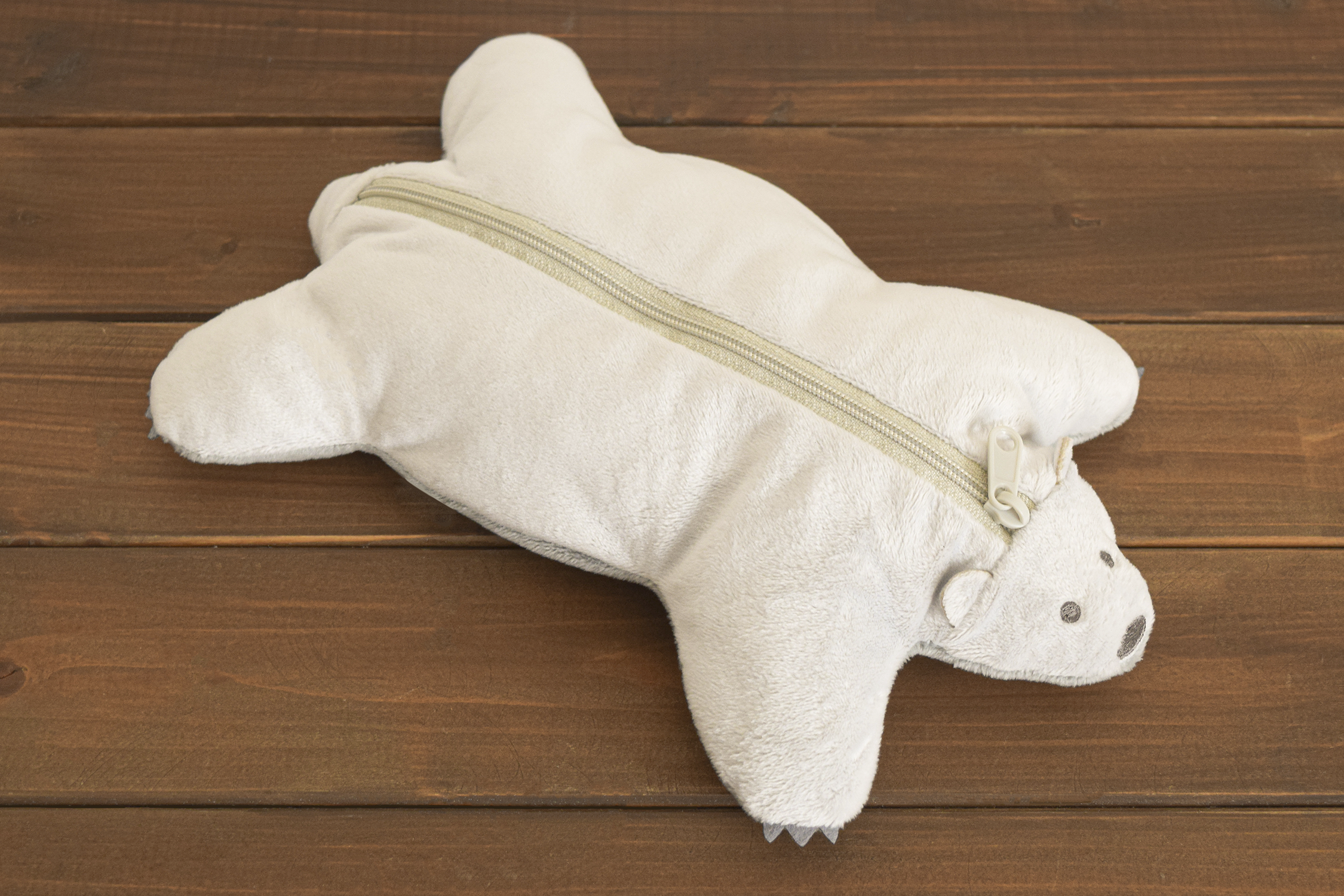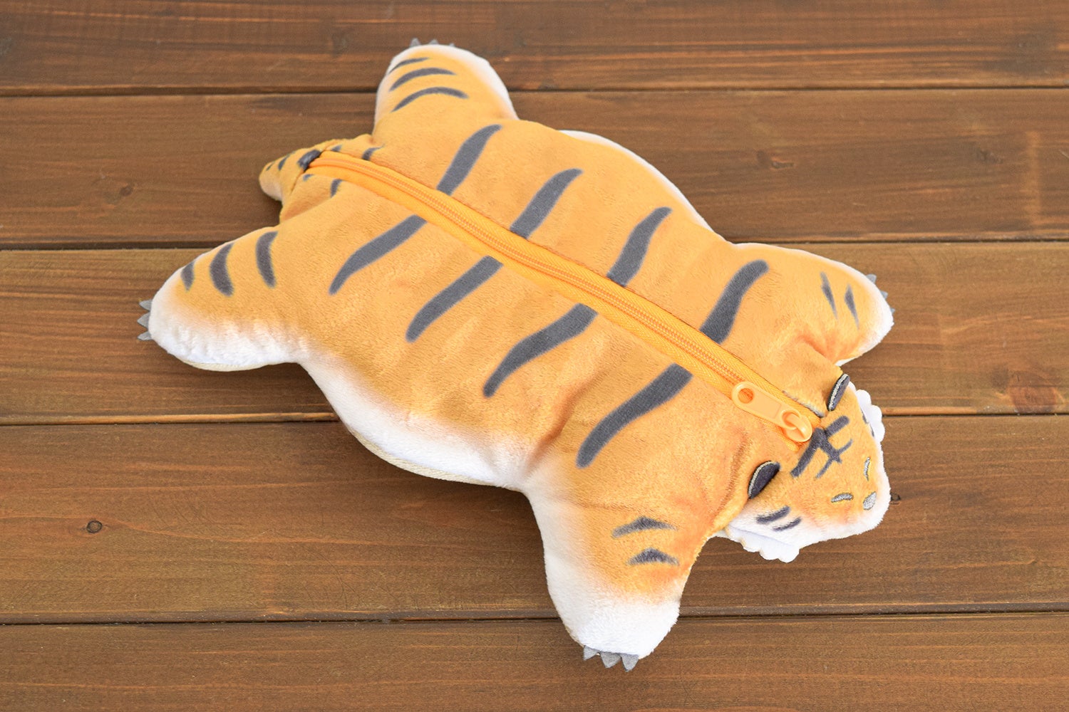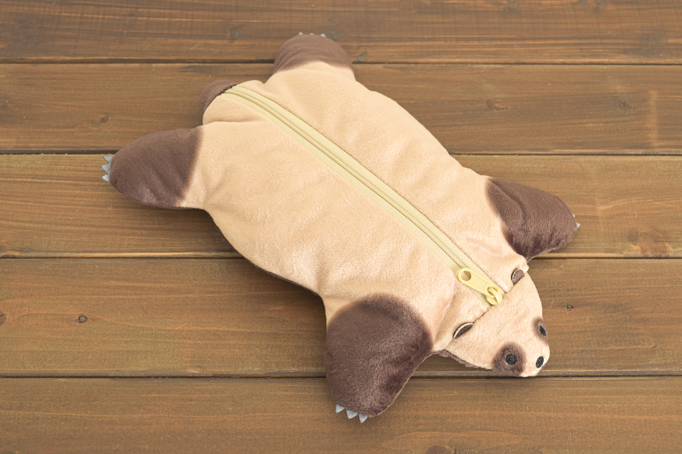 全体をフラットな形状にすることで、ノートや書類の間に挟んで持ち運びができ、ふとバッグの中をのぞいたときにチラ見えする、リラックスモードの動物たちに癒されます。背中のファスナーを開けると、ペンを約10本収納できる実用性も兼ね備えています。