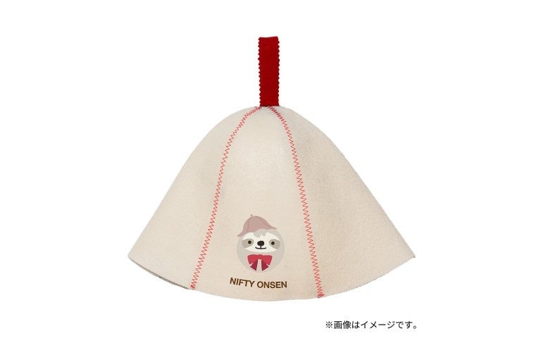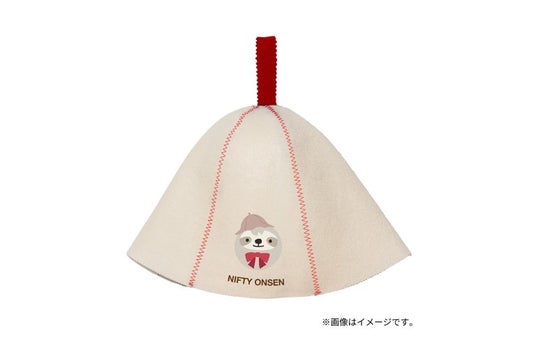 ニフティ温泉のキャラクター、なまけものの「なもちゃん」が刺繍されたオリジナルのサウナハットです。