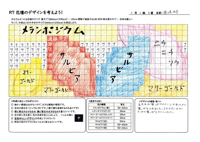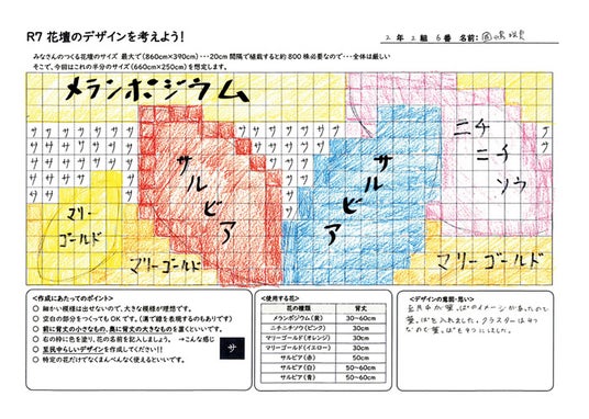 フラワー・ブラボー・コンクールの花を使って、花壇に植えるデザインの設計図を考案します。