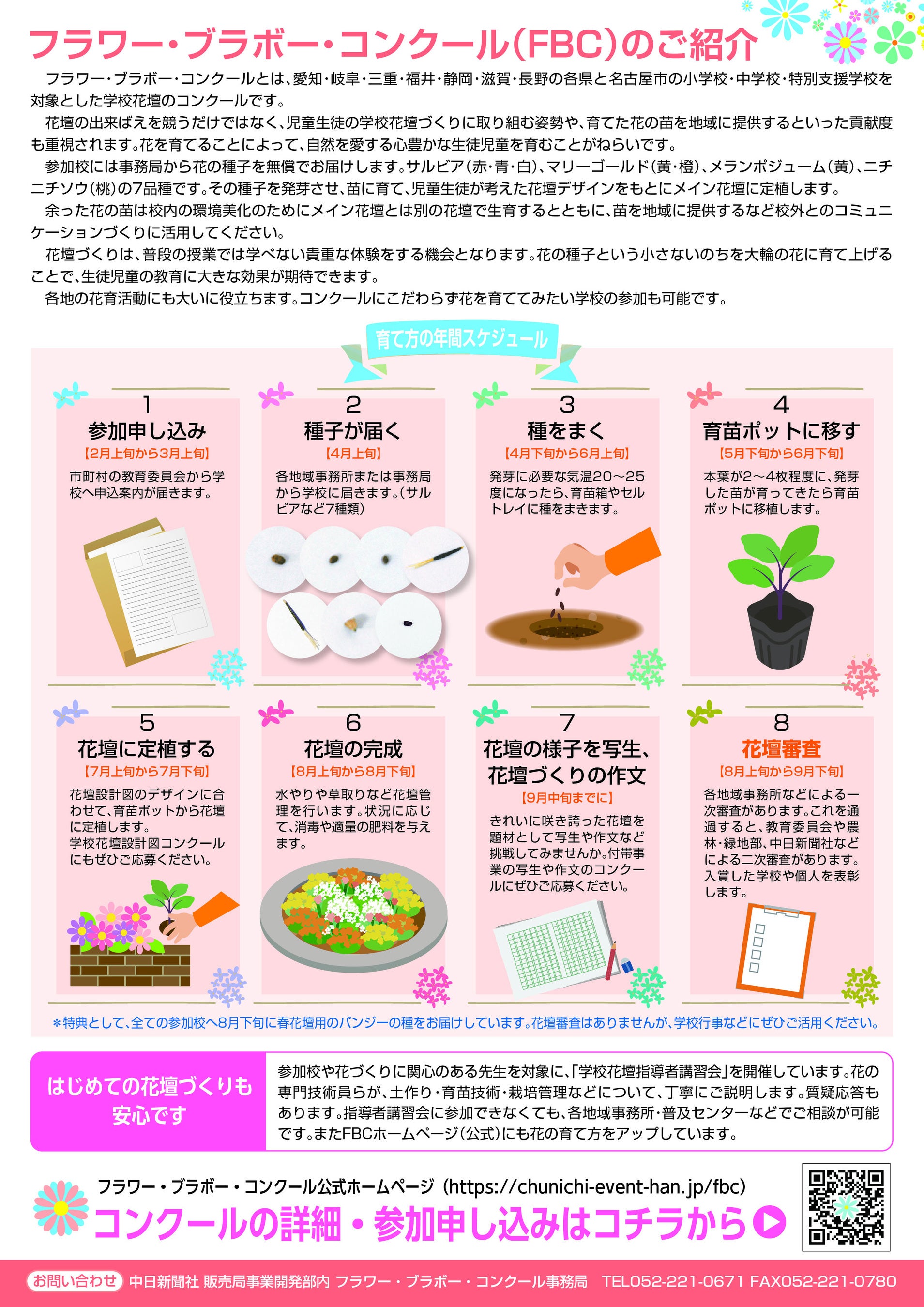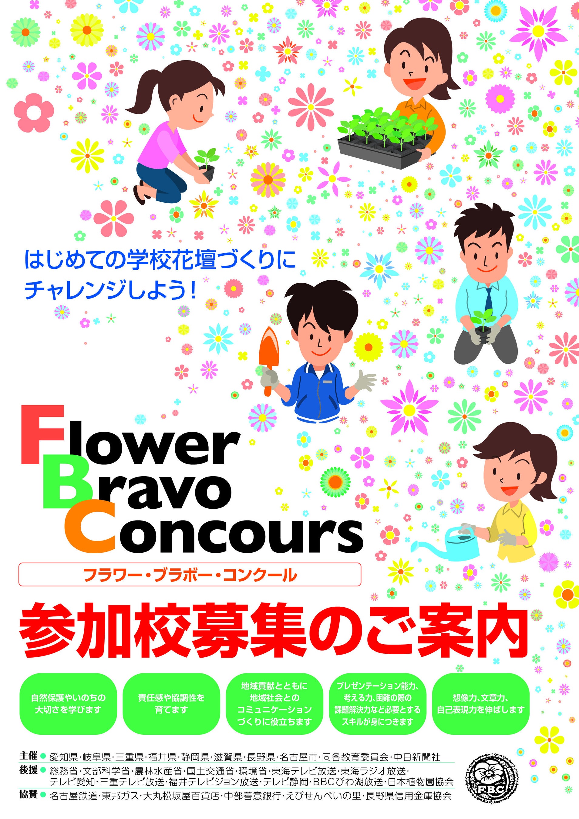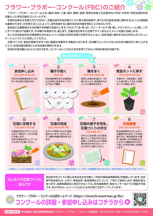 愛知県・名古屋市・岐阜県・三重県・福井県・静岡県・滋賀県・長野県と中日新聞社で組織するフラワー・ブラボー・コンクール(FBC)実行委員会では令和8年度の参加校を募集しています。ぜひご参加ください。