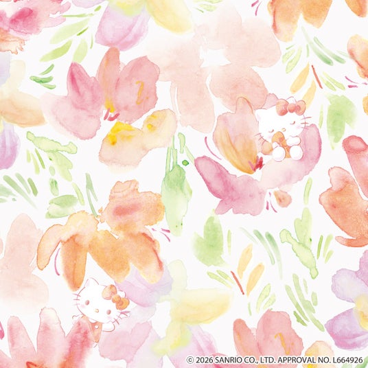ベビーピンクやコーラルオレンジのお花畑でハローキティがかくれんぼ。甘く柔らかな暖色がハローキティの可愛さを引き立て、ふんわり包み込むようなムードをまとわせます。
