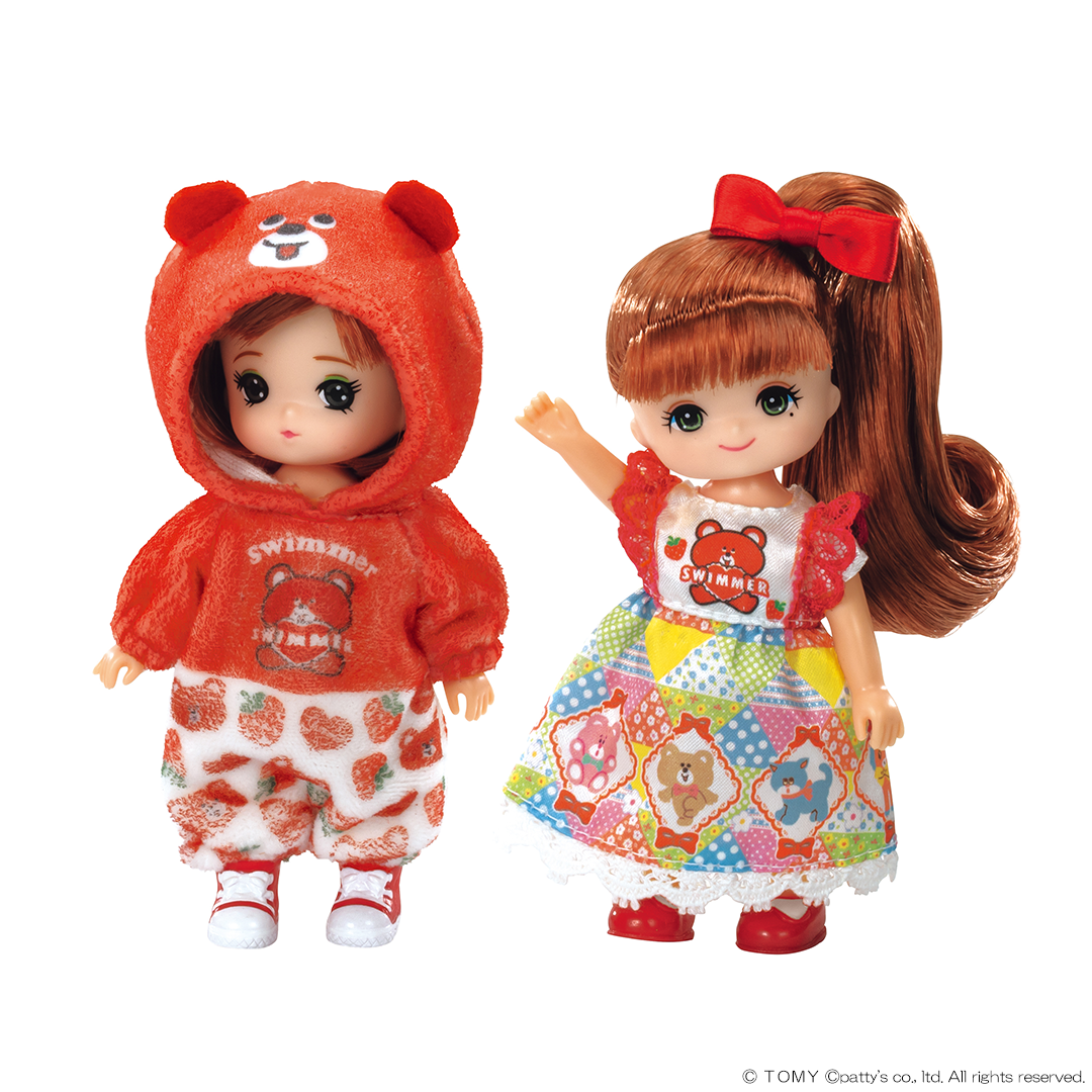 ミキちゃんは「スイクマちゃん」のフードが付いたパーカー、マキちゃんは「SWIMMERだいすきリカちゃん」とお揃いのデザインのワンピースコーデです。
