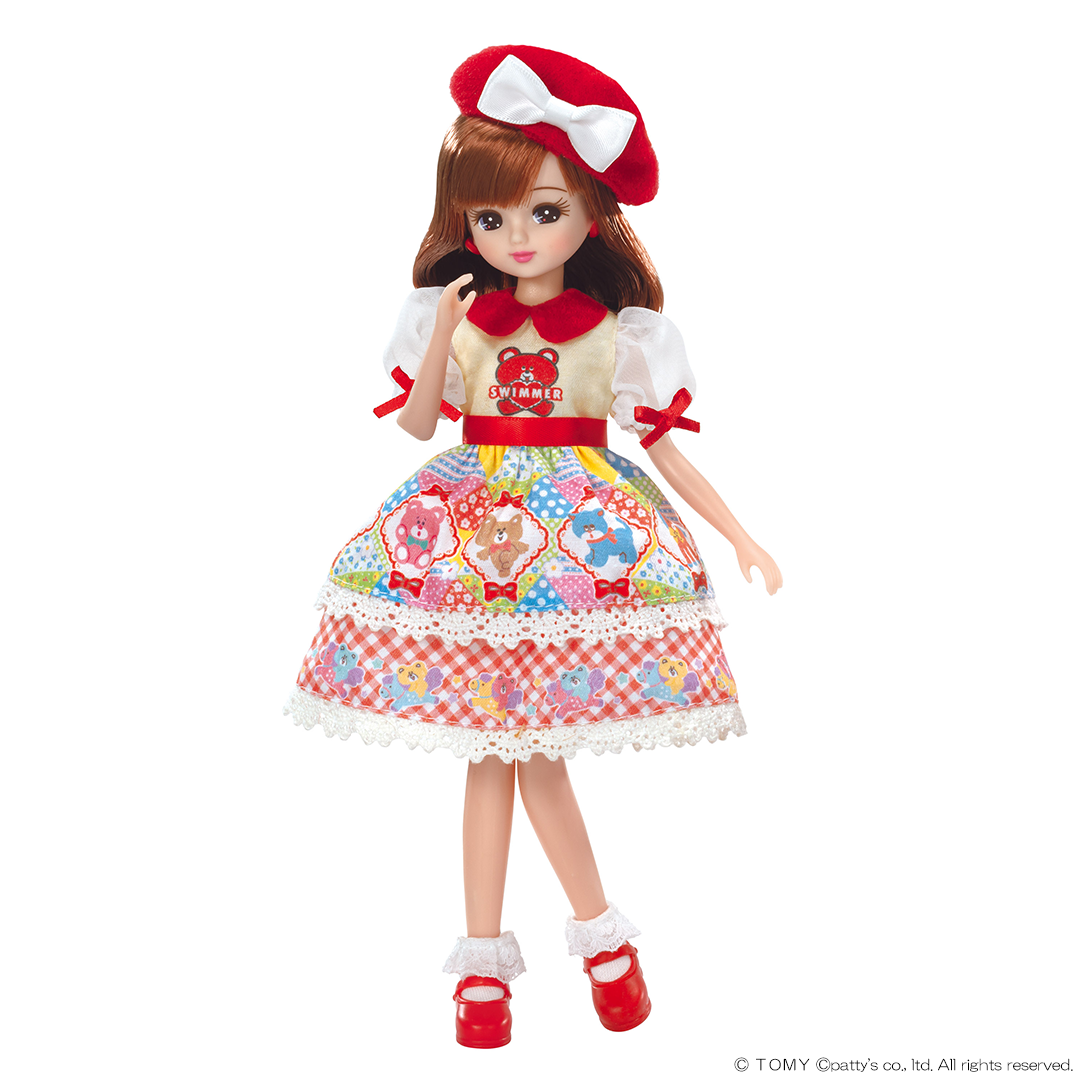 SWIMMERテイストのドレスがとってもかわいい!「スイクマちゃん」プリントのトップスは袖口のリボンもポイント♪ベレー帽は別売りのルーム「インテリアコーディネート SWIMMERルーム」に付属する「シャポードール(帽子たて)」にかけることができます。