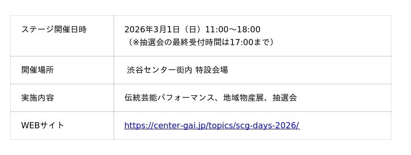 今回の「SCG DAYs 2026」は、渋谷センター街を単なる買い物の場を超えた、日本の魅力を再発見するための「都市型ショーケース」へと進化させる試みです 。 街全体をメディア化し、全国各地の伝統芸能や特産品をこの場所で披露・展示することで、以下の価値を創出します。■地方にとって