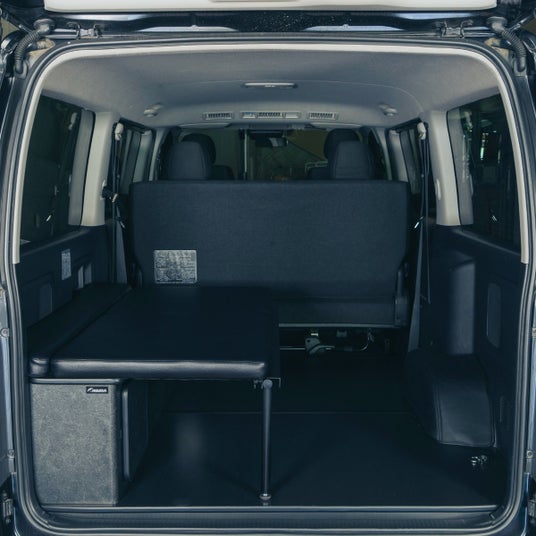 ファントムブラック ハーフベッドセットはハーフベッドとサイドボックスを軸に構成した、シンプルなハーフベッドのセット構成。必要なときだけベッドを展開できるハーフフラット構造は、荷物の積載性とくつろぎの空間づくりを柔軟に両立。