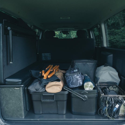 使い勝手と快適性を両立したラゲッジキット。ハーフベッドとフロアパネル、サイドボックスを一体設計することで、車内に無駄のない機能的なレイアウトを実現。必要なときだけベッドを展開できるハーフフラット構造は、荷物の積載性とくつろぎの空間づくりを柔軟に両立。