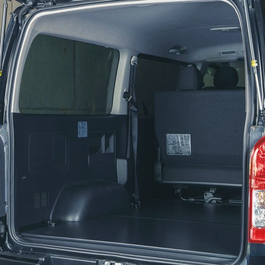 ハイエースの荷室をより使いやすくアップグレードする、専用設計の オプション フロアパネルキット。耐久性と質感に優れたPVCレザーを採用し、純正フロアの段差を解消してフラットで歩きやすい床面を形成。