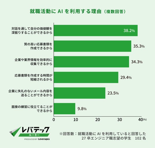 利用理由については「対話を通して自分の価値観を深掘りすることができるから(38.2%)」や「質の高い応募書類を作成できるから(35.3%)」が上位に挙がりました。