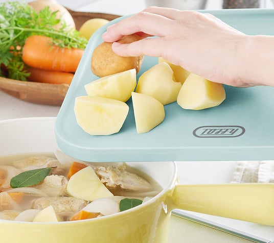 「Toffy 水切り付きカッティングボード」は、まな板としての使用に加え、裏返すことで水切りトレーとしても使える1枚2役のカッティングボードです。まな板面は、奥側にゆるやかな傾斜とフチが付いていることで、切った食材や水気がこぼれにくく、作業スペースが汚れにくいのがポイント。また、手前側はフラット形状のため、切った食材をフライパンや鍋などへ移しやすく、下ごしらえから調理までをスムーズに行えます。