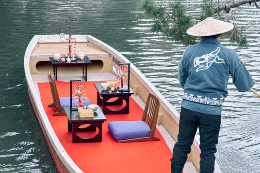 川下りの舟に小さなさげもんや柳川まりをしつらえ、赤い毛氈(もうせん)と和傘が春の光に映える特別貸切舟に。