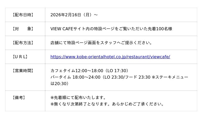 神戸メリケンパークオリエンタルホテル(兵庫県神戸市中央区)は、ホテル最上階(14階)のバー「VIEW BAR」にてご好評いただいている喫茶営業を、「VIEW CAFE」(ビュー カフェ)時間とし、公式サイトページを本日公開いたしました。 サイト公開を記念して、特設ページをご覧いただいた先着100名様に、ささやかなプチギフトをプレゼントいたします。
