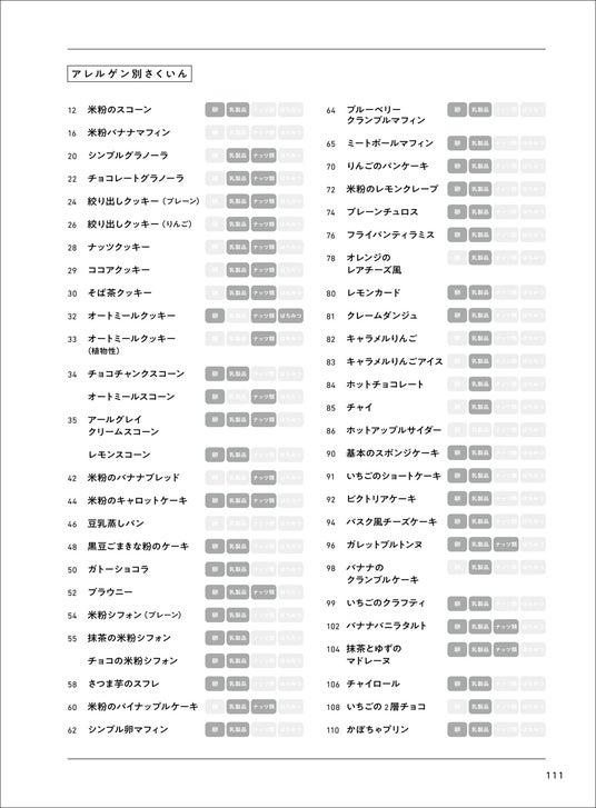 乳製品・卵・ナッツ・蜂蜜など、気になる食材についてはアイコン表記を採用。