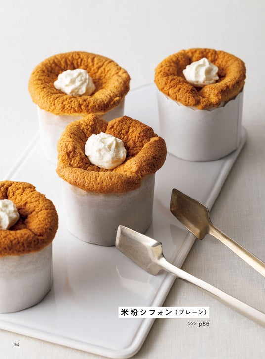 2章では米粉バナナブレッド、キャロットケーキ、ガトーショコラ、米粉シフォンといった、しっとりふわふわの焼き菓子が並びます。