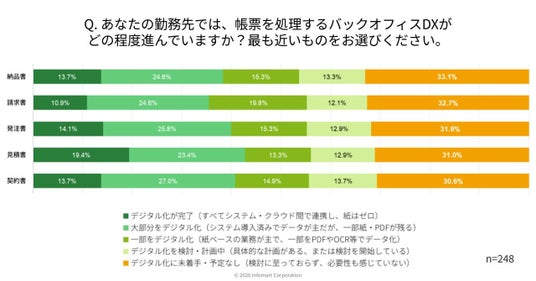 バックオフィスDXの進捗状況について、帳票(見積書・契約書・発注書・納品書・請求書)別に聞いたところ(n=248)、すべての帳票において「デジタル化に未着手・予定なし(検討に至っておらず、必要性も感じていない)」が3割以上で最多となりました。