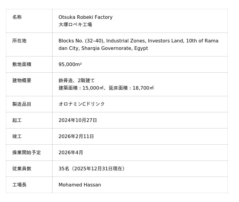 大塚製薬株式会社(本社:東京都、代表取締役社長:井上 眞、以下「大塚製薬」)のエジプト子会社であるアラブ大塚ニュートラシューティカルズ株式会社(以下「AON」)は、エジプトおよび中東エリアにおける炭酸栄養ドリンク「オロナミンCドリンク」(以下「オロナミンC」)の需要拡大に対応するため、「大塚ロベキ工場」を開設し、現地時間2月11日に竣工式を行いました。当工場はニュートラシューティカルズ関連事業として、エジプト初の工場となります。当工場で製造したオロナミンCは、2026年5月よりエジプト国内で販売を開始し、その後、同年7月より中東エリアへの展開を予定しています。