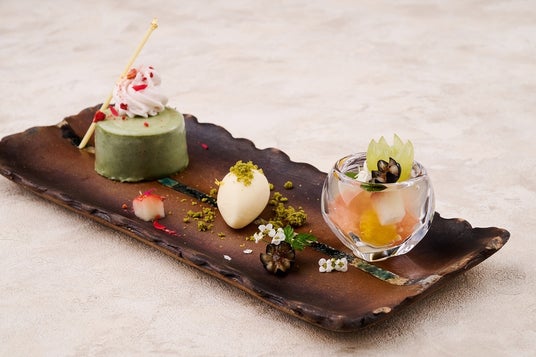 南国と和の要素が調和したなめらかな「ココナツと抹茶のムース」、すっきりとした後味を楽しめる「シークワーサーのソルベ」、爽やかで甘い香りが広がる「水盆に見立てたエルダーフラワーのジュレ」を取り揃えました。