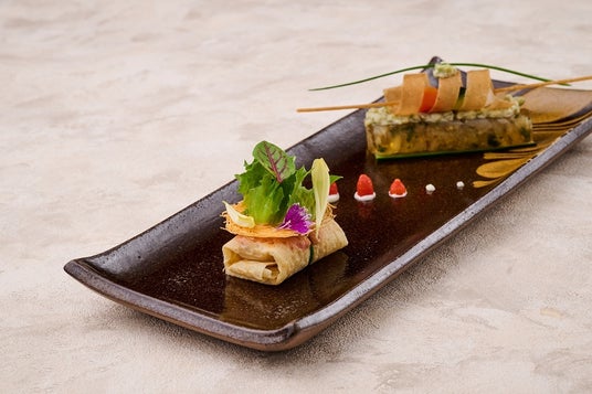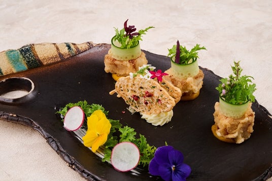 脂の甘みが特徴の「美ら島あぐー豚タンの煮込みのフリット」は植木鉢に、香ばしさが際立つ「黄人参のピューレとチーズチュイル 庭園風」は蝶に見立て、春を迎えたパティオを表現しています。