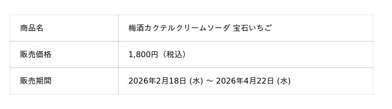 チョーヤ梅酒株式会社 (本社:大阪府羽曳野市、社長:金銅重弘、以下チョーヤ) は、梅酒カクテル専門店「The CHOYA 銀座BAR (ザ チョーヤ ギンザバー) 」にて、紀州産南高梅100%の梅酒をベースに旬のイチゴをふんだんに使用した梅酒カクテルクリームソーダ「宝石いちご (ホウセキイチゴ) 」を2026年2月18日 (水) から2026年4月22日 (水) まで期間限定で販売します。