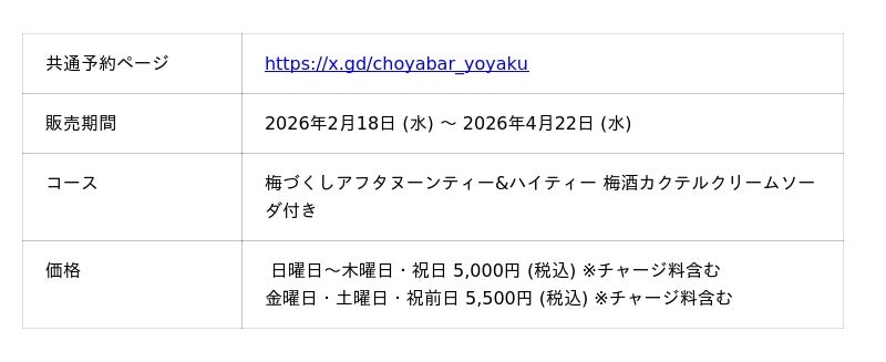 ■2026年2月18日~2026年4月22日100種類以上のドリンクが飲み放題!梅づくしアフタヌーンティーのデザートに!(予約URL: https://x.gd/choyabar_yoyaku )
