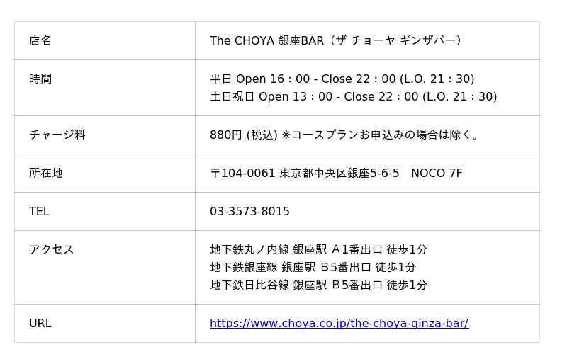 The CHOYA 銀座BARでは、お客様に「常に梅との新しい出会い」をお届けする事をコンセプトにこれからも運営して参ります。梅気分の際には、お気軽にお立ち寄りください。