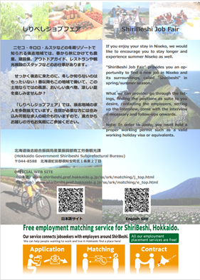 後志総合振興局では、管内市町村や関係機関と連携のもと、管内の人手不足解消のため、無料職業紹介所を開設し、求職者と管内求人をマッチングする『しりべし「まち・ひと・しごと」マッチングプラン推進事業』を実施しております。管内のスキーリゾートエリアでは、冬期になると毎年道外及び海外から多くの方々がやってきて勤務しておりますが、その大半は春になると雇用期間が終了し、当地を離れてしまいます。