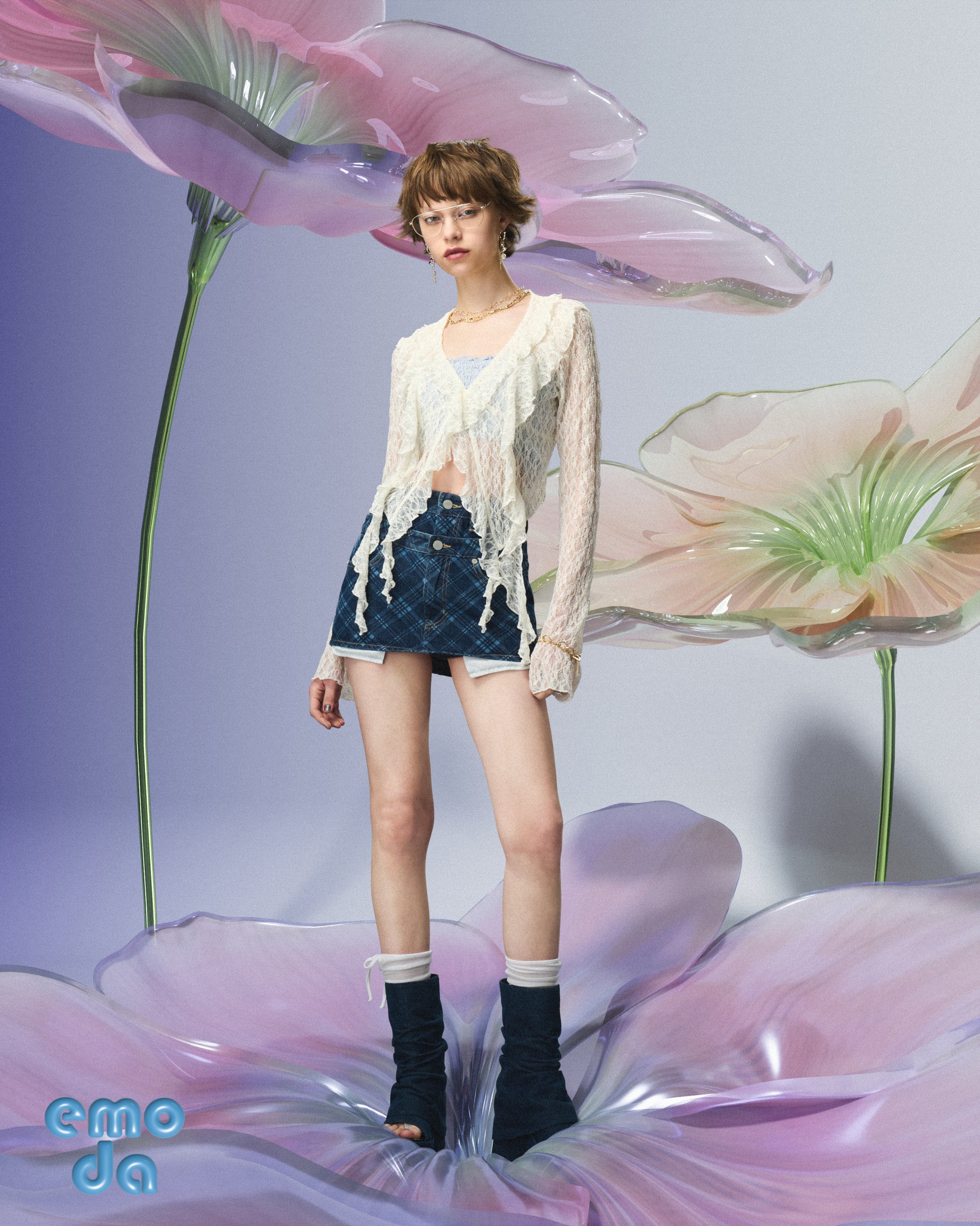 今回のLOOKは柔らかく、優しいムードを意味する「gentle (ジェントル) 」がテーマ。淡いカラーや軽やかなディテールをベースに、アイテムや素材でシャープさを加えスタイリングにエッジをプラス。相反するエッセンスを重ねた、EMODAらしい「gentle (ジェントル) 」を表現します。2025年に引き続き、CGグラフィックを使用し進歩的な空間をクリエイト。従来、大文字で表記しているブランドロゴをシーズンコンセプトにあわせて小文字で作成し、柔らかなムードを表現しています。