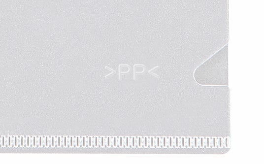 「軽量クリアーファイル」「軽量クリアーホルダー」ともプラスチック各部品の素材をすべてポリプロピレンに統一。より効果的にリサイクルしやすい単一素材の設計です。廃棄時にもわかりやすいよう「>PP<」の材質表記を本体に入れています。