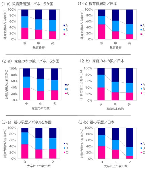 パネル5か国、日本の双方において、いずれの指標においても「低い/少ないほど計算力がC層(低め)の割合が高い」「高い/多いほど計算力がA層(高め)の割合が高い」という典型的なSES(家庭の社会経済的背景)の相関が見られました。いずれも、統計的に有意な結果となりました(p < 0.05)。
