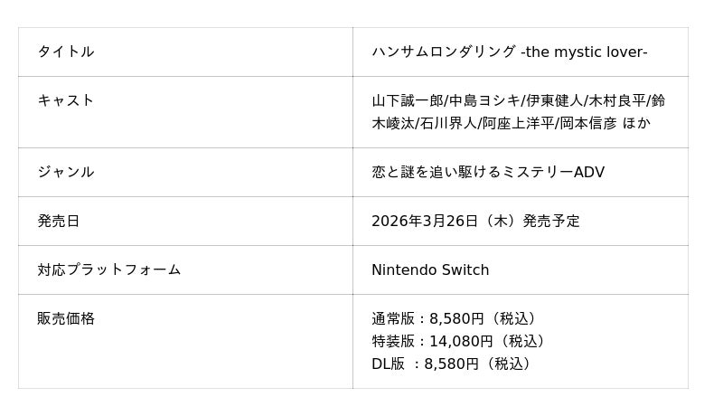 株式会社エディア(本社:東京都千代田区、代表取締役社長:賀島 義成、以下:エディア)は、子会社である株式会社ティームエンタテインメント(本社 :東京都千代田区、代表取締役社長 :賀島 義成、以下:ティームエンタテインメント)の女性向けCDレーベル「MintLip(ミントリップ)」より展開中のオリジナルドラマシリーズ『ハンサムロンダリング』から、コンシューマ向けブランド「MintLip+(Plus)」の新作乙女ゲームNintendo Switch『ハンサムロンダリング -the mystic lover-』のダウンロード版を本日2026年2月12日(木)より予約受付を開始したことをお知らせいたします。