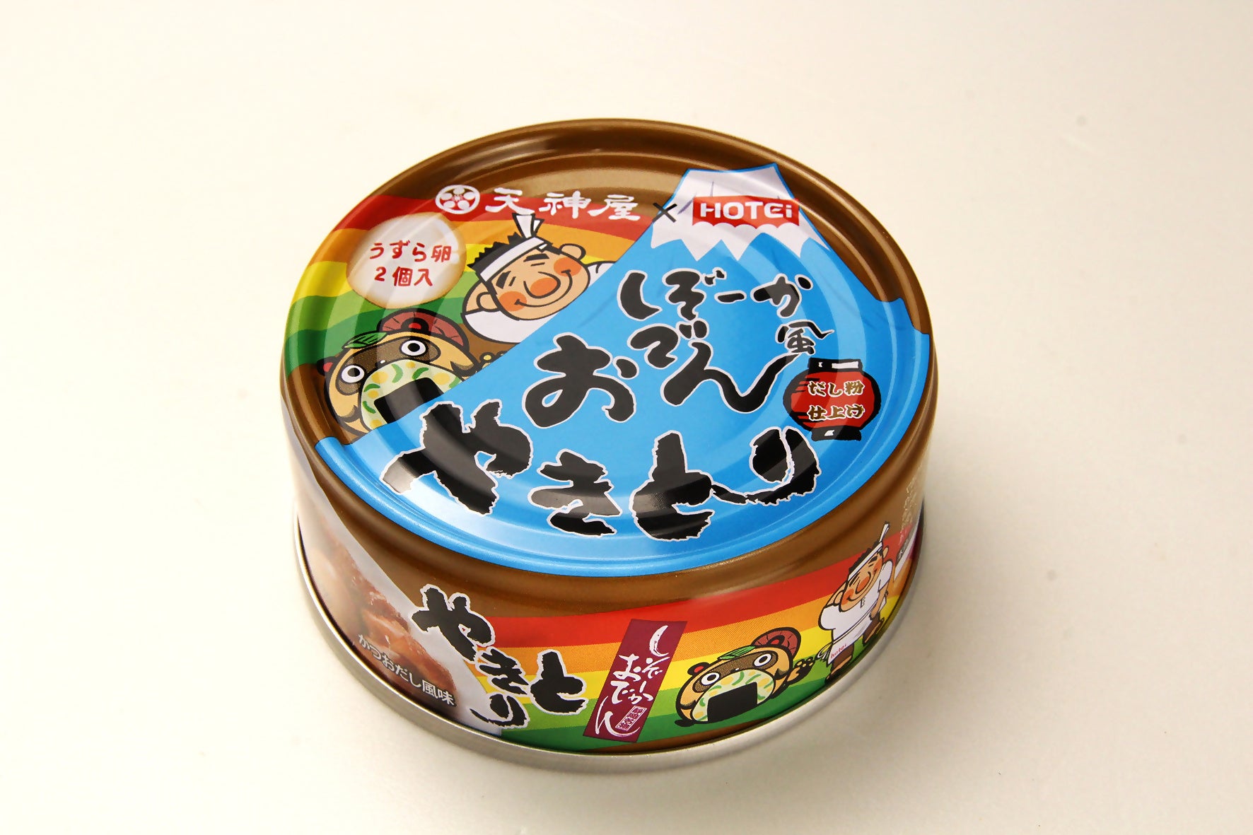 静岡の食文化を広めるため、天神屋とホテイフーズがコラボレーションした缶詰商品です。国産鶏肉とうずら卵を使用し、炭火焼の香ばしさに天神屋ならではの醤油ベースの旨みを重ねました。静岡おでんの風味を“やきとり”という新しい形で楽しめる、静岡発の名物商品です。